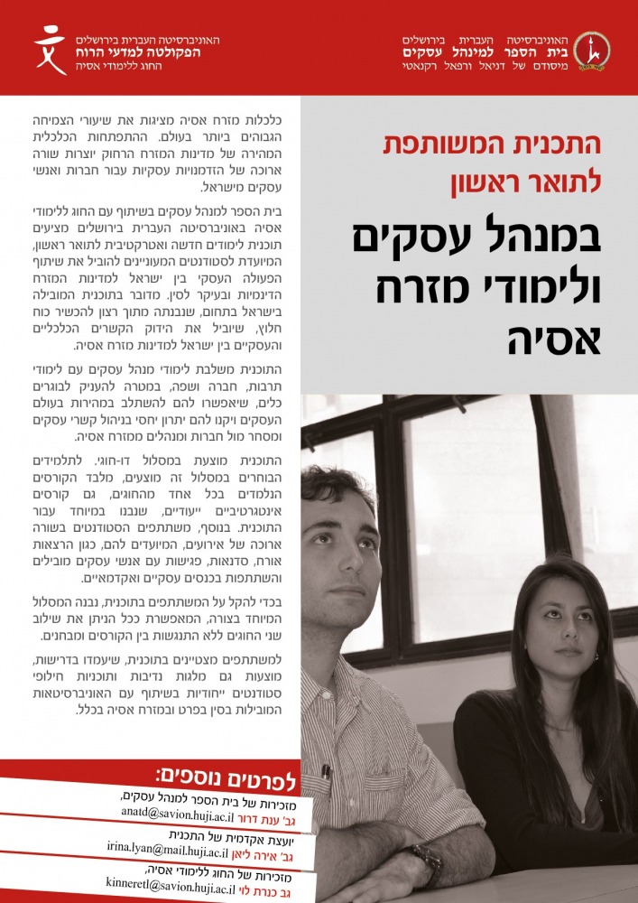 התוכנית משלבת לימודי מנהל עסקים עם לימודי תרבות, חברה ושפה, במטרה להעניק לבוגרים כלים, שיאפשרו להם להשתלב במהירות בעולם העסקים ויקנו להם יתרון יחסי בניהול קשרי עסקים ומסחר מול חברות ומנהלים מסין.